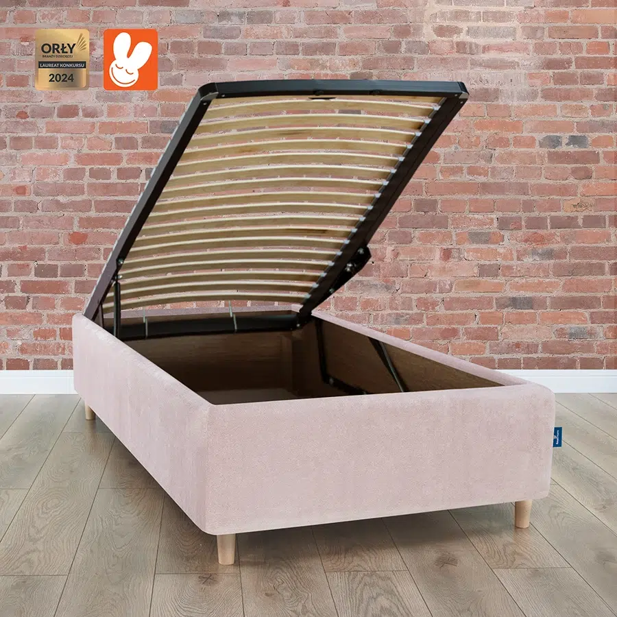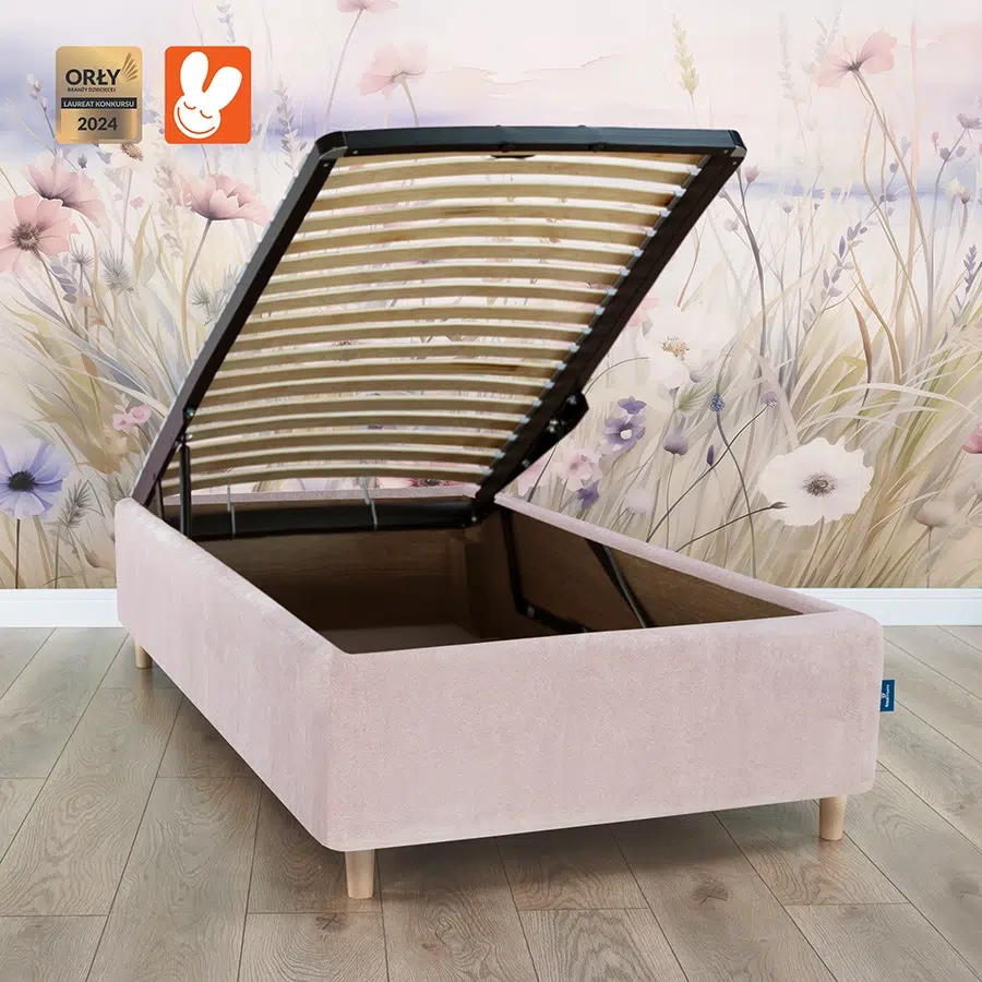 Pod stelażem znajduje się duża skrzynia do przechowywania np. pościeli.