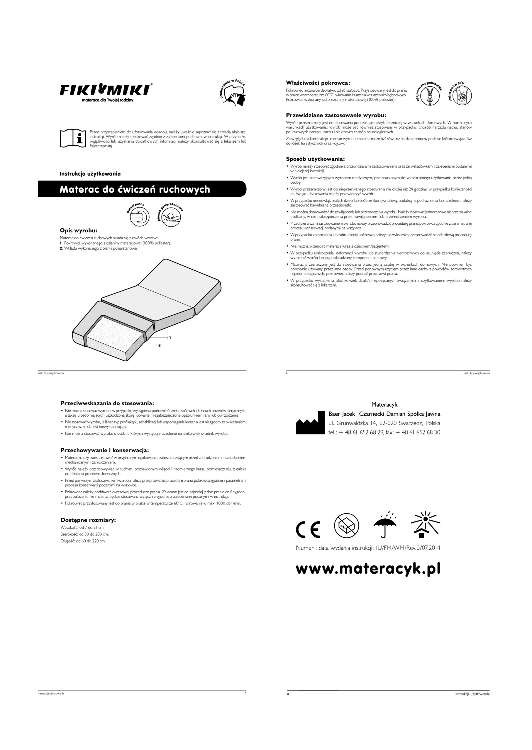W razie wystąpienia każdego poważnego incydentu związanego z wyrobem, należy niezwłocznie poinformować producenta o tym zdarzeniu pisemnie na adres: Materacyk Baer Jacek, Czarnecki Damian Spółka Jawna, ul. Grunwaldzka 14, 62–020 Swarzędz, Polska; elektronicznie na adres e–mail: biuro@materacyk.pl lub telefonicznie pod numerem telefonu: +48 501 218 009 oraz właściwy organ państwa członkowskiego, na którego terytorium miał miejsce incydent.